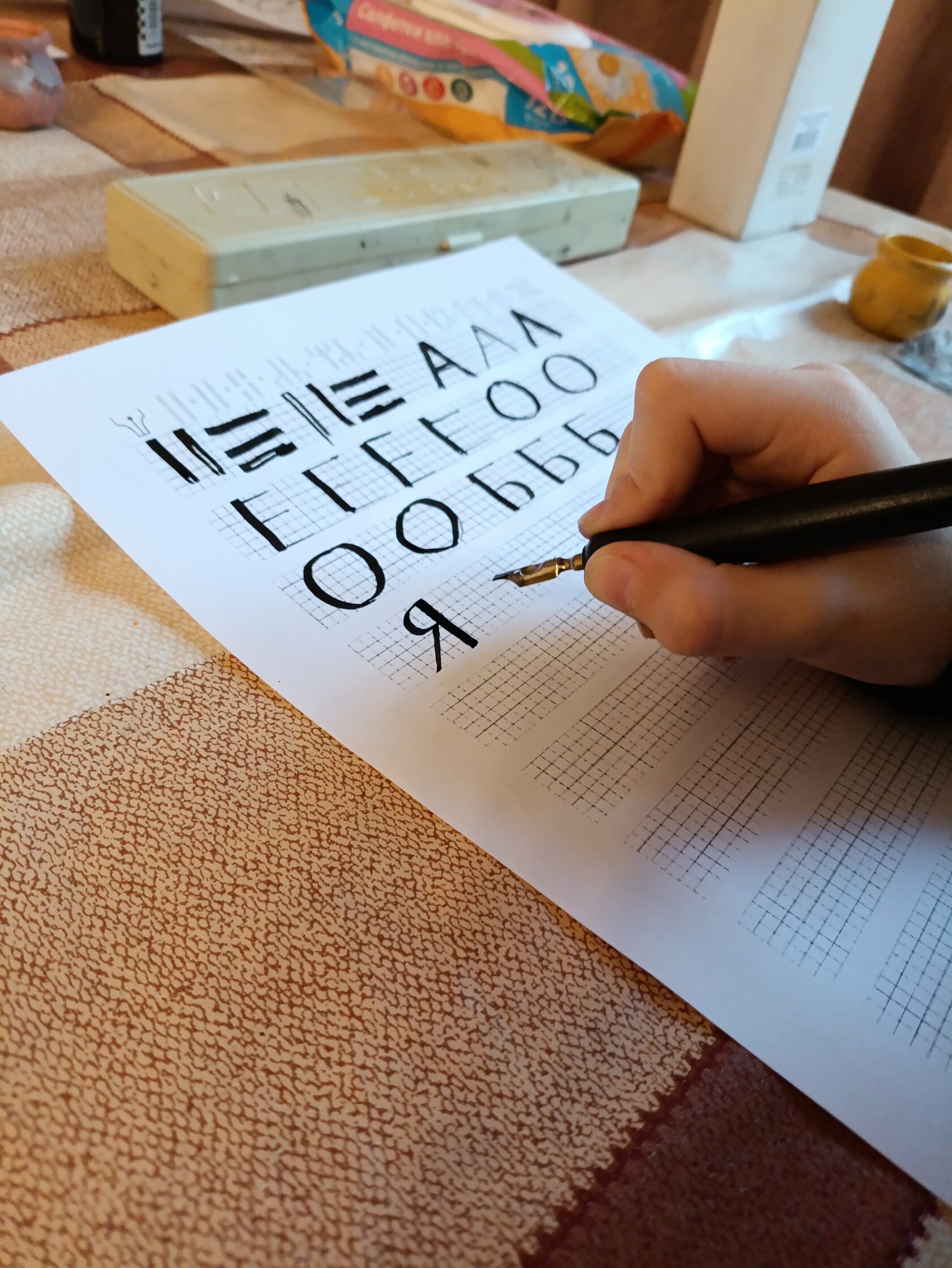 Группа Кудрявого Ёжика набирается всё большего мастерства в навыках по каллиграфии. На прошедшем занятии ребята продолжали практиковаться в написании пером под нулевым углом наклона пера, пробовали рисовать орнамент. А ещё мы писали на английском и немецком языках!